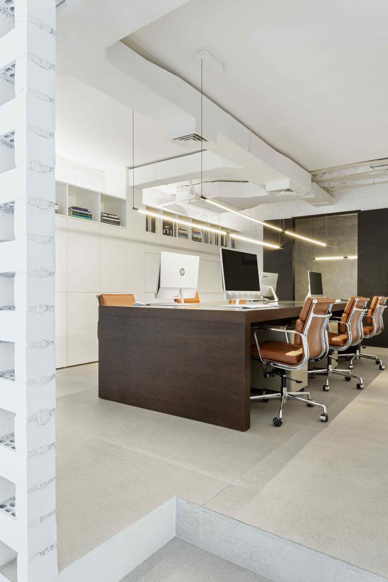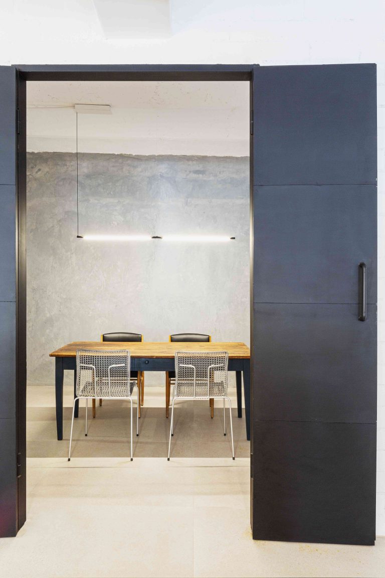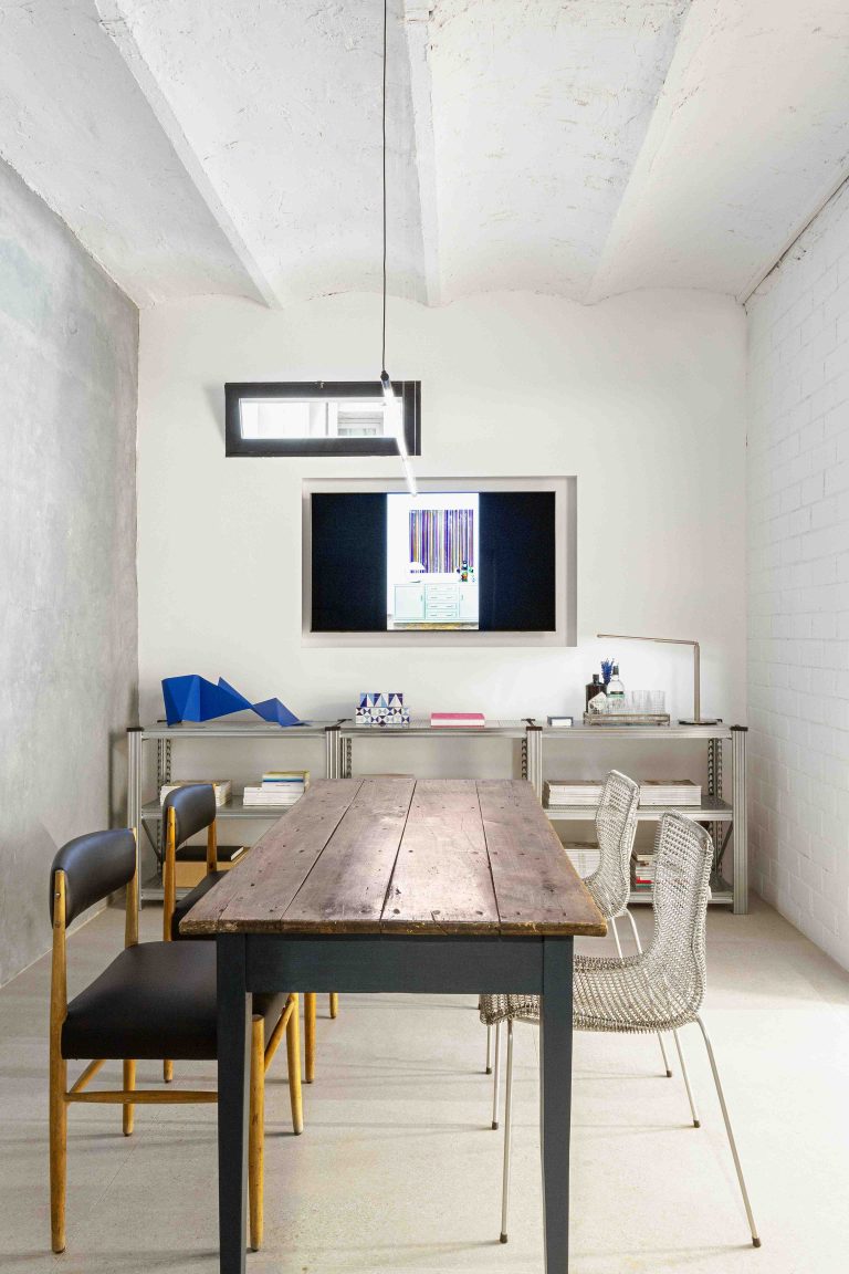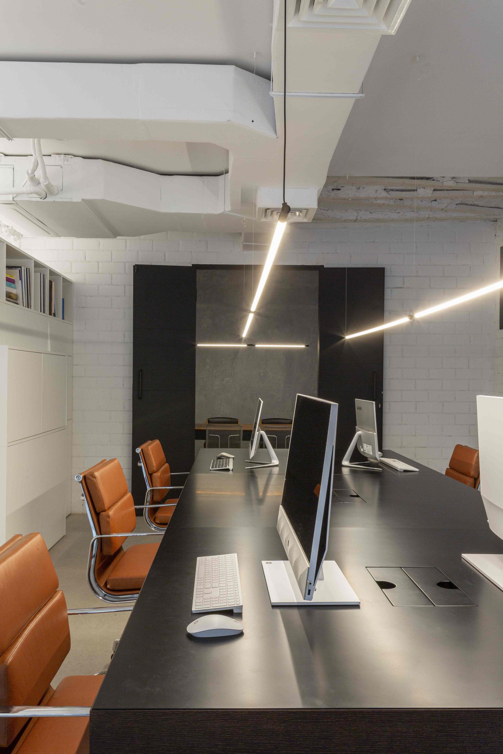 The ensemble is completed by lighting and finishing choices that underline the studio's practical vocation. The linear luminaires, the large tables and the integration of technical elements allow a fluid operation in each area. The overall image is that of a professional, coherent space, designed for comfortable working, where every detail contributes to the identity of the studio and to a clear and well-resolved design environment.