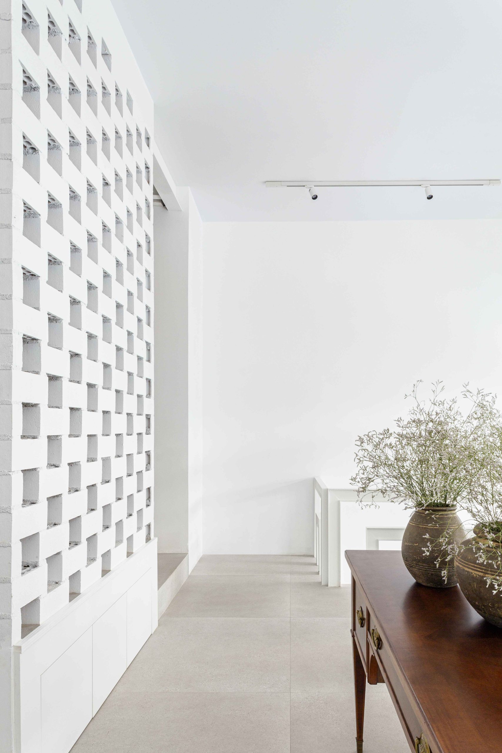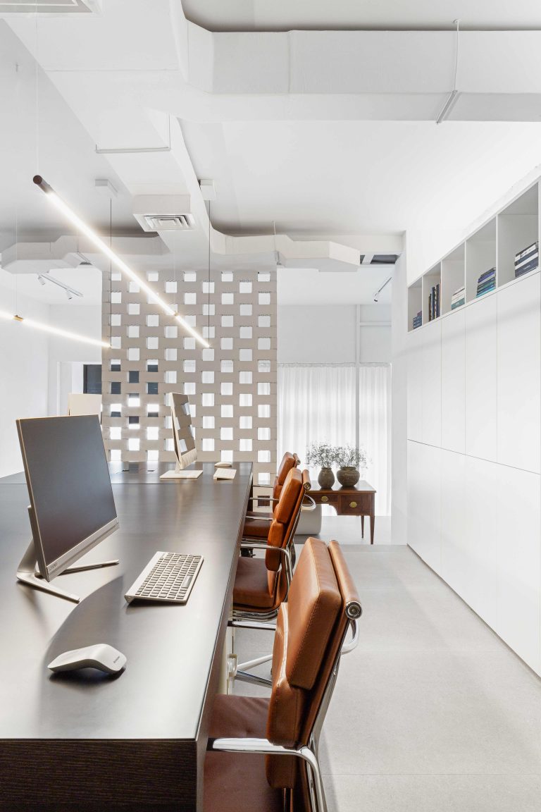 The project incorporates complementary zones that reinforce the studio's identity: meeting areas, reception spaces and integrated storage points. The perforated walls and interior louvres act as visual filters that divide without closing off, maintaining the sensation of spaciousness and allowing flexibility in daily use. The selection of furniture responds to criteria of functionality and contemporary aesthetics, with light pieces, refined lines and a layout that prioritises the efficiency of the space.