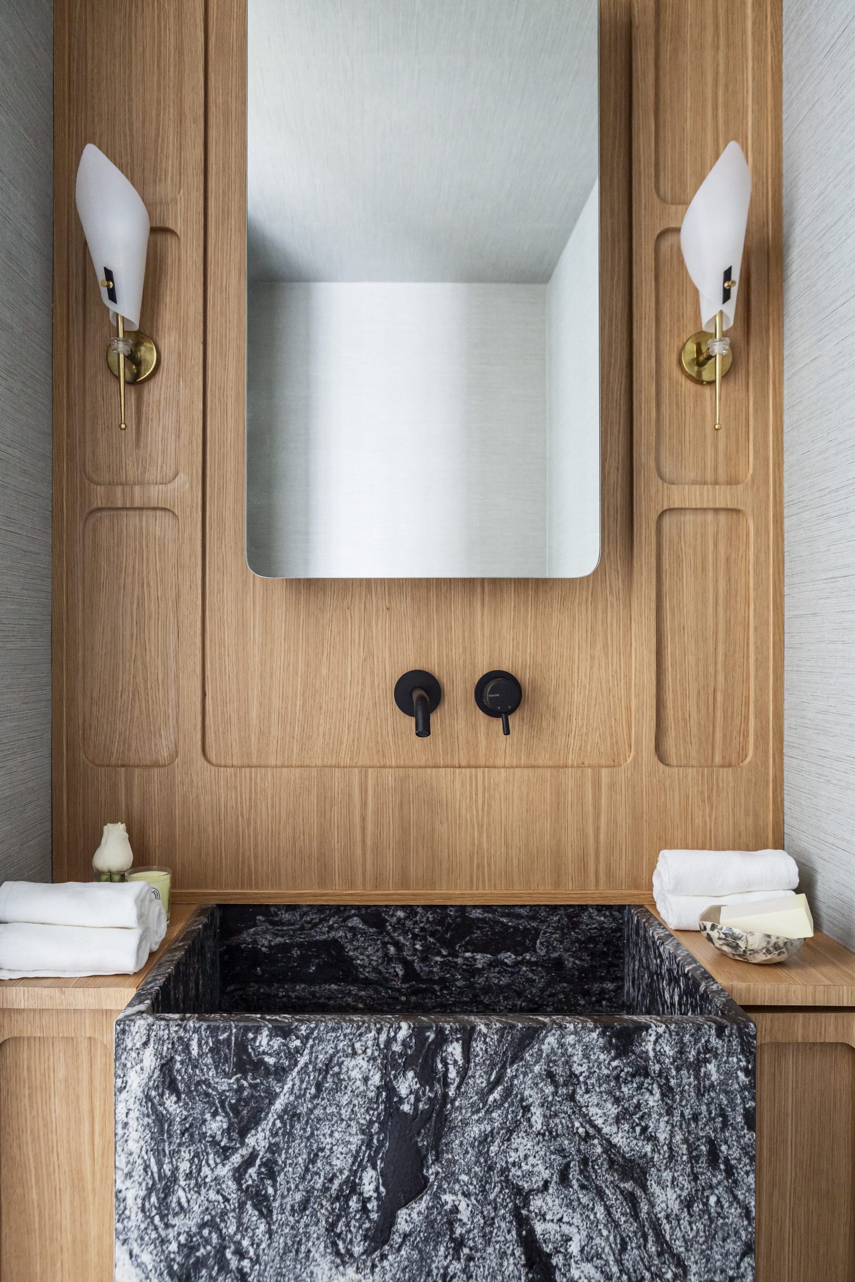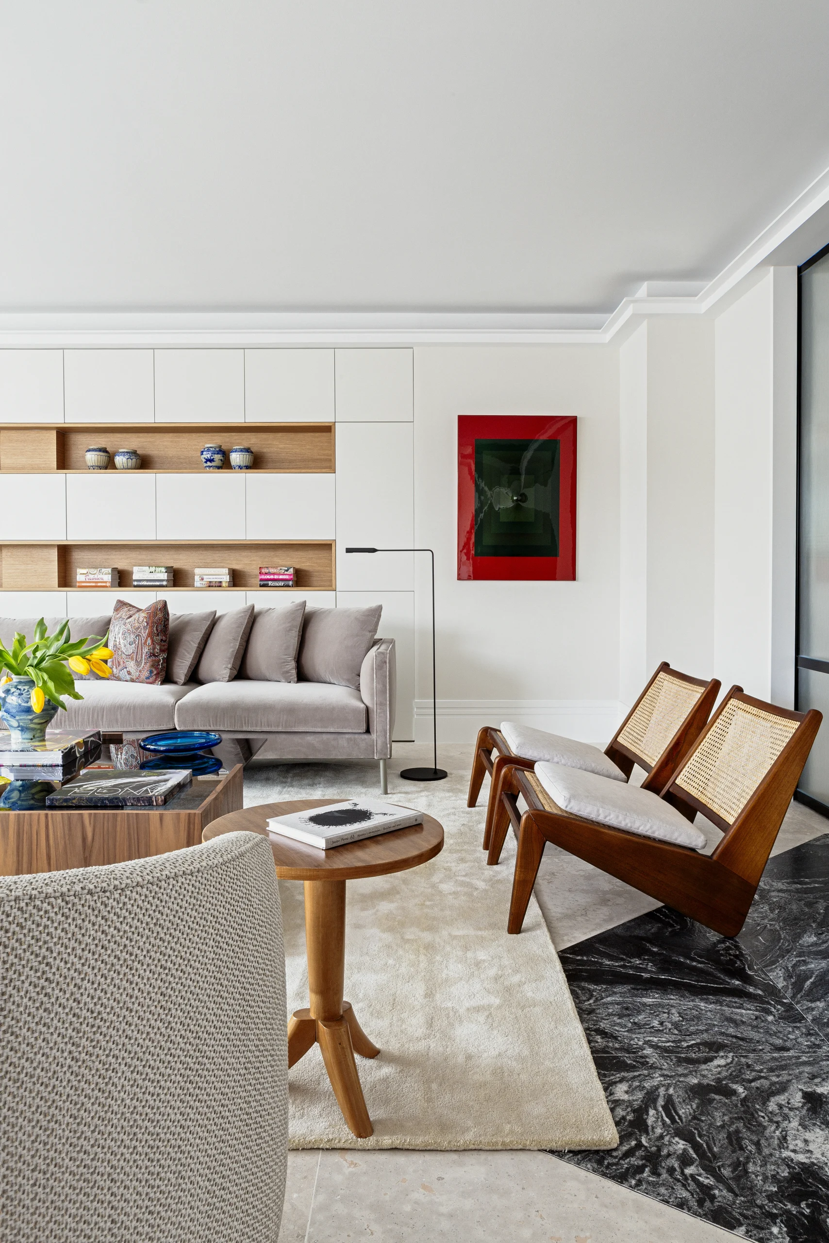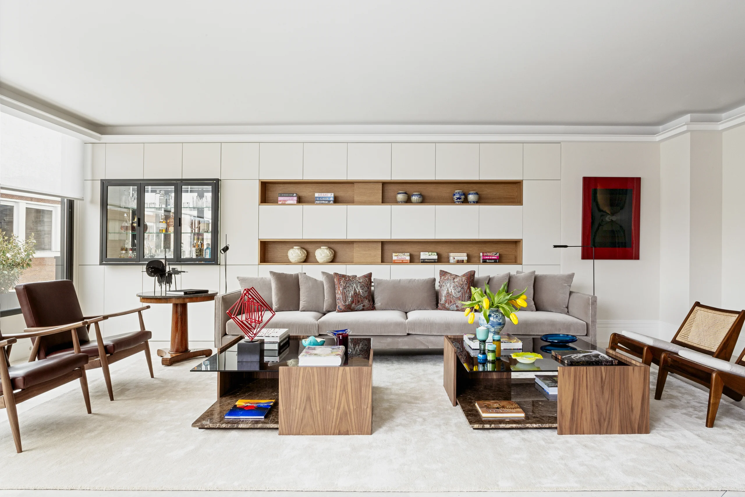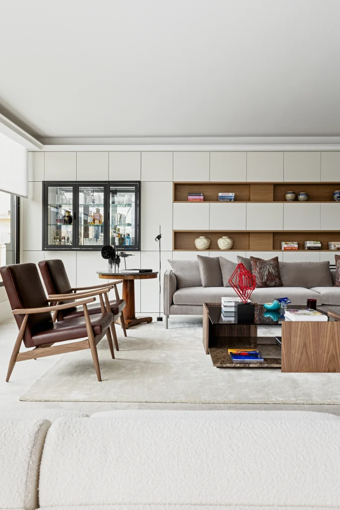 En la vivienda destacan algunas soluciones diseñadas a medida por Ricardo de la Torre, como es el caso de gran mueble del salón, hecho de madera, que aprovecha el espacio añadiendo mucho almacenaje con estilo. De esta forma, se salvaba el escalonado de paredes, ya que es un muro colindante con el edificio y tiene partes más retranqueadas que otras. Además de estanterías y espacio de almacenaje, la pieza integra un elegante mueble bar.