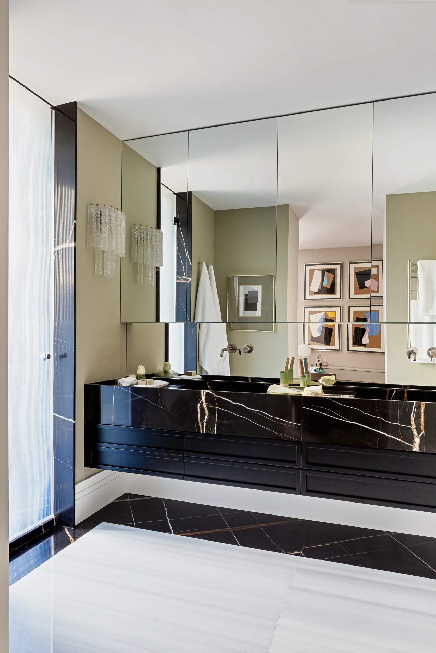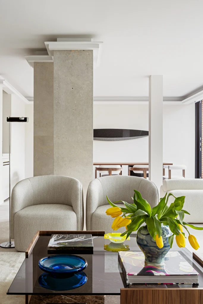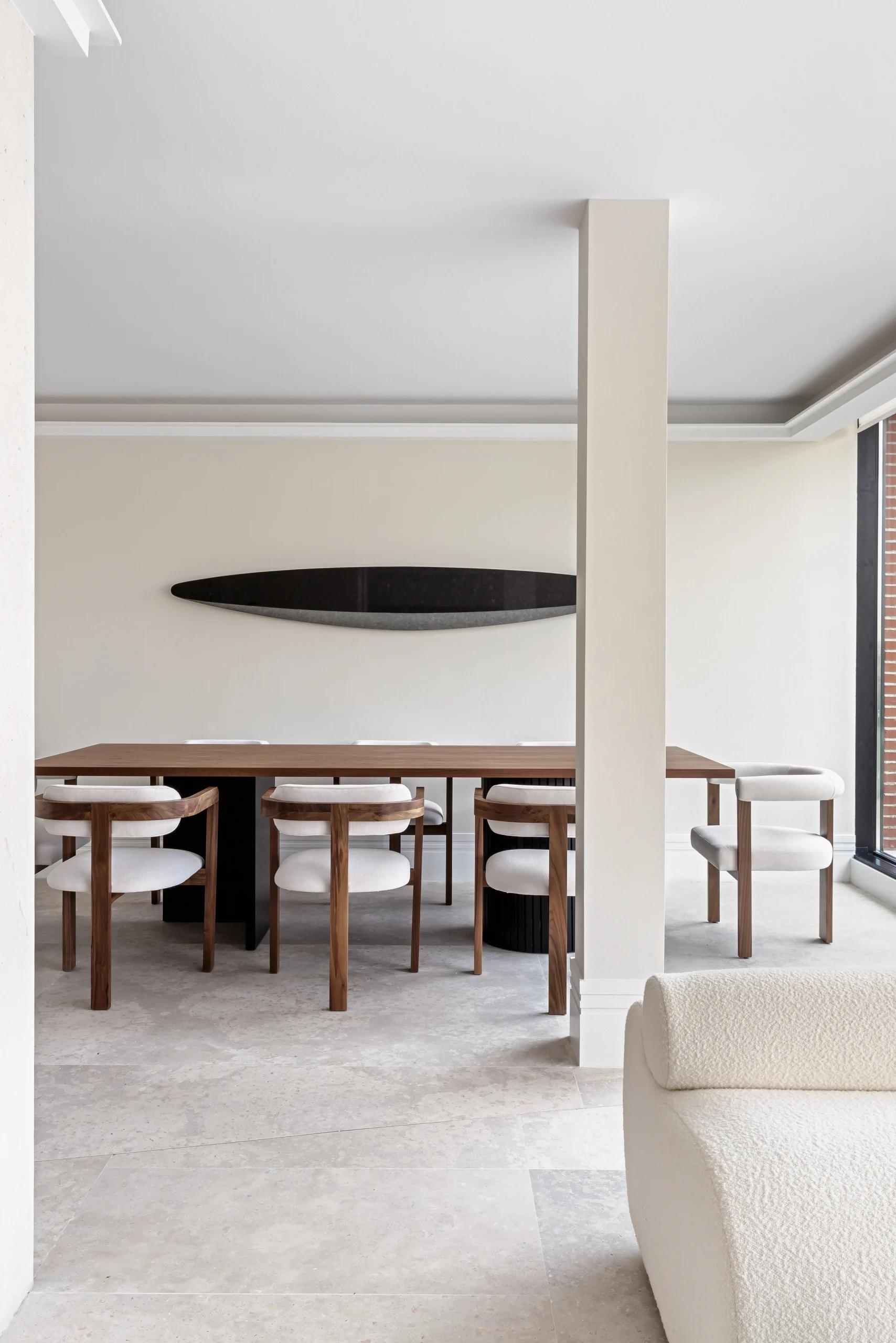 El proyecto derrocha elegancia y pureza, con un delicado interiorismo en el que el diseño y el arte llenan de vida espacios precisos y amplios. De ser un espacio compartimentado y oscuro, el piso se ha transformado en un concepto abierto, que juega con la flexibilidad a través de puertas correderas y, sobre todo, muy luminoso. Especialmente la zona común, en la que cocina, comedor y salón comparten espacio y se comunican de forma directa con la terraza de la vivienda.