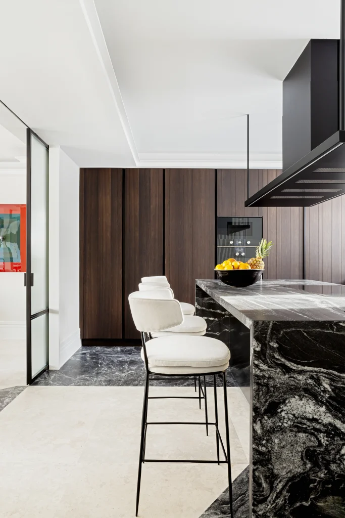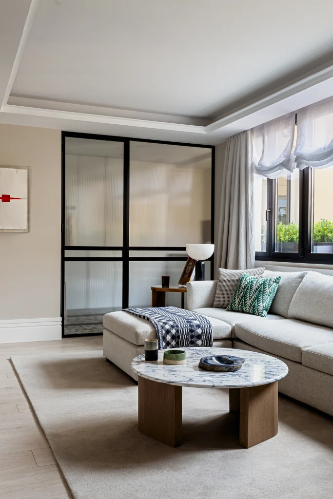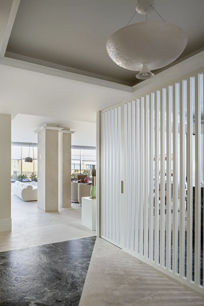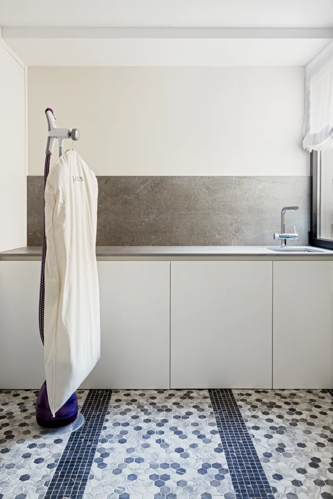 El mayor reto del proyecto fue jugar con diferentes materiales en los suelos, desde la entrada hasta la terraza, formando dibujos geométricos de gran tamaño, haciéndolo muy sutil y elegante.