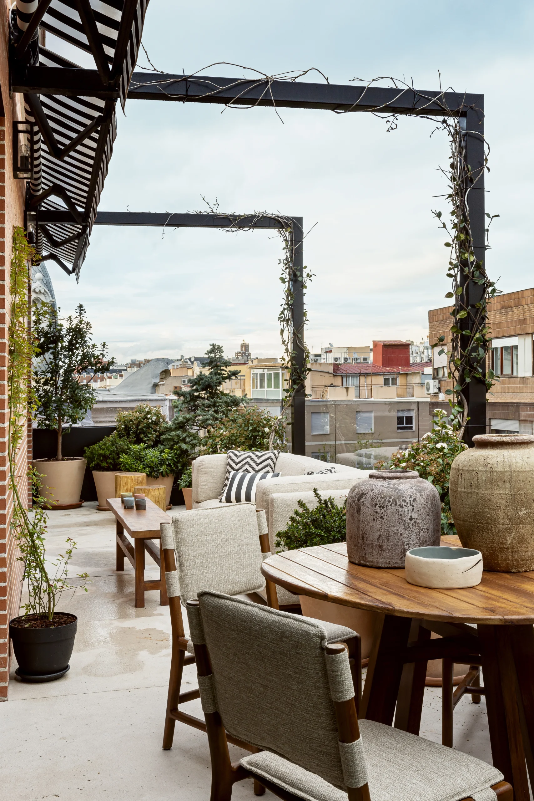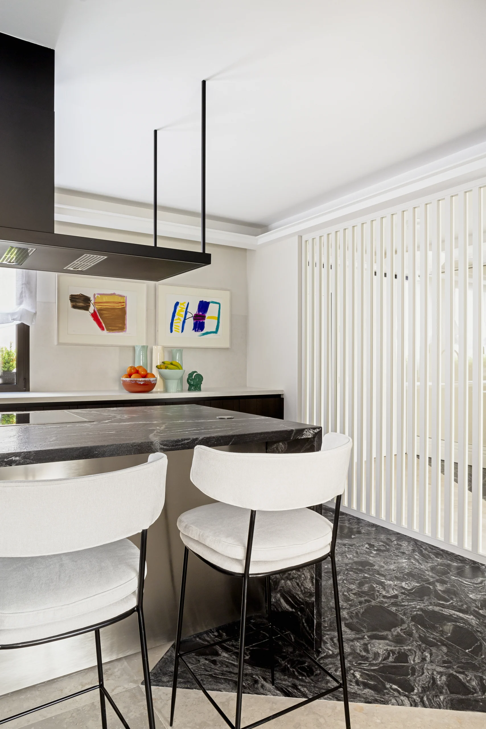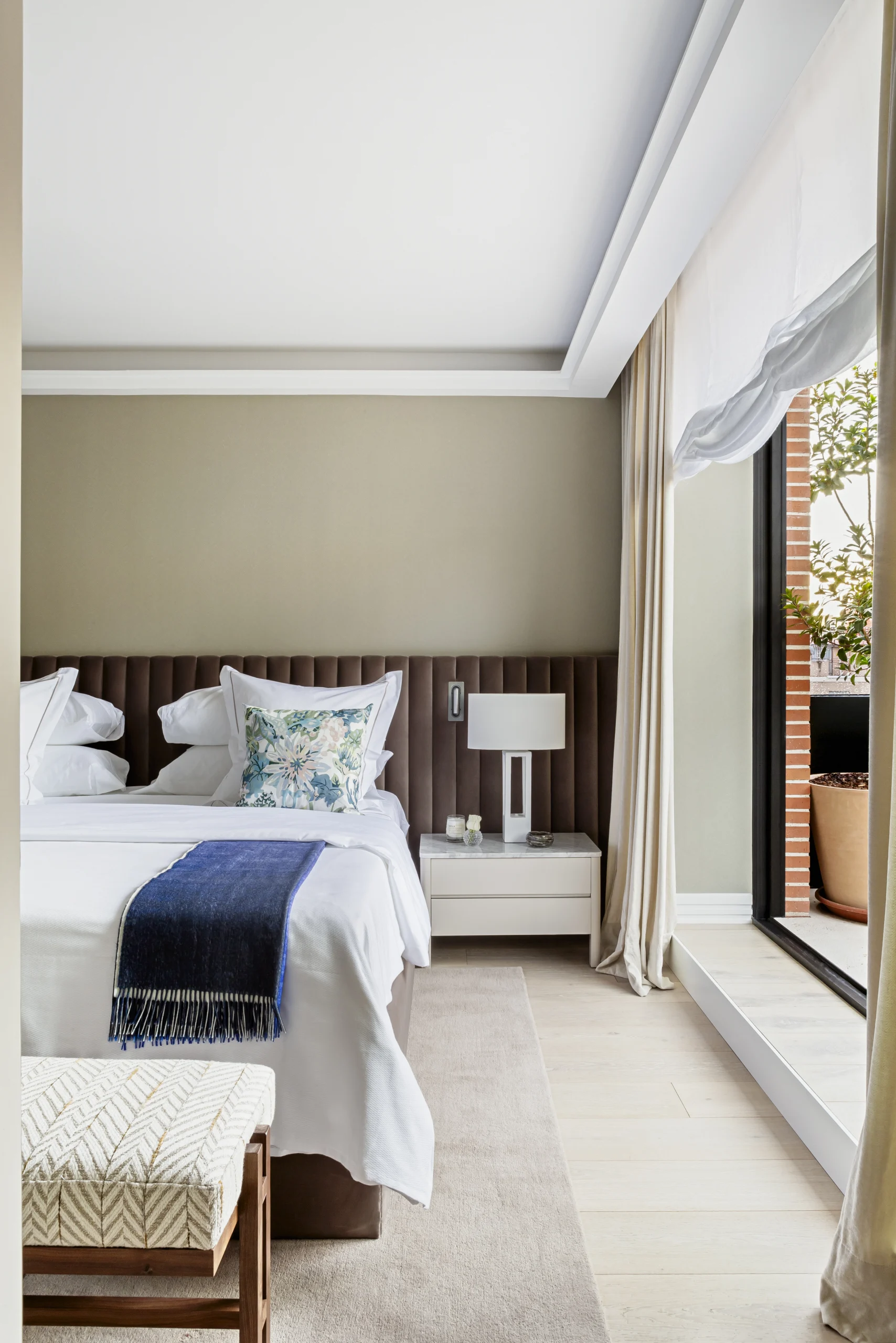 Muy cerca, en la cocina, se instalaron unas puertas correderas y una división de listones de madera que comunican y delimitan el espacio. Las puertas correderas que dan a salón ha sido una solución para tener más intimidad cuando fuera necesaria. El ático cuenta con tres dormitorios con baños incorporados, uno de ellos, el principal, con vestidor y salida a la terraza. Todo el diseño es de Ricardo de la Torre, incluyendo el cabecero, mesillas de noche, lámparas de sobremesa y banquetas.